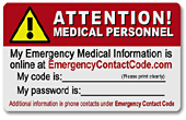 The Code on the EMI Card, gives Medical Personnel immediate access to contact Information such as family members, friends, Caregivers and Doctors. The EMI Password, gives further access to secure emergency medical information that pertains to medication allergies and current medications. All information can be obtained online in a matter of seconds.